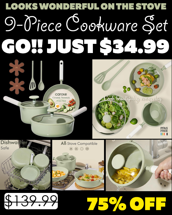 75% OFF a 9 piece ceramic cookware set for $34.99…