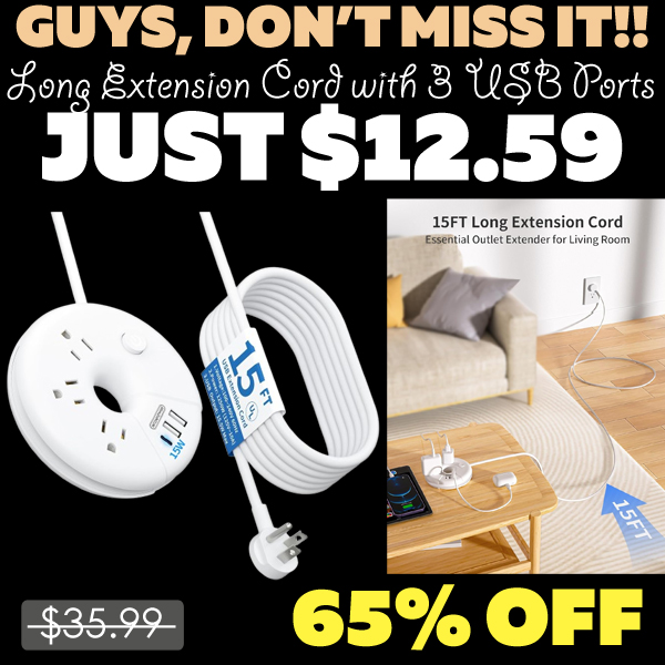 Long Extension Cord with 3 USB Ports Only $12.59 (Regularly $35.99)